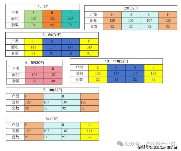 主打107-225平户型,部分楼栋的户型面积分布如下