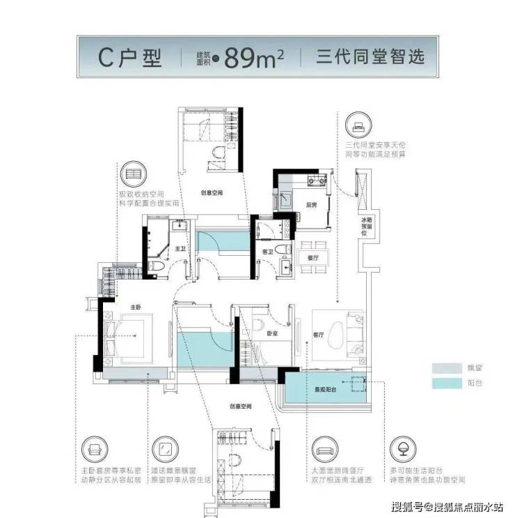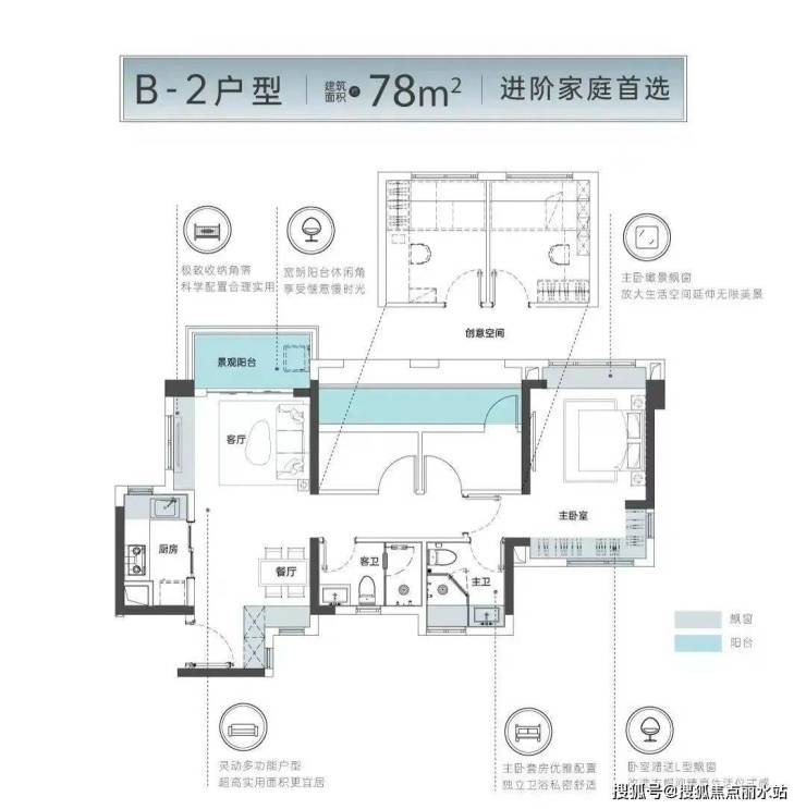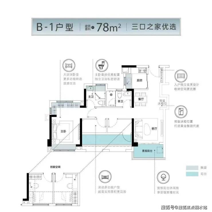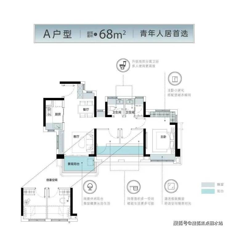 68㎡做到三房两卫,且有较多可以利用的飘窗、阳台面积,这是该项目的一大亮点。
