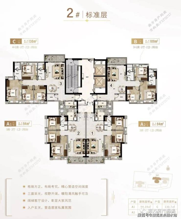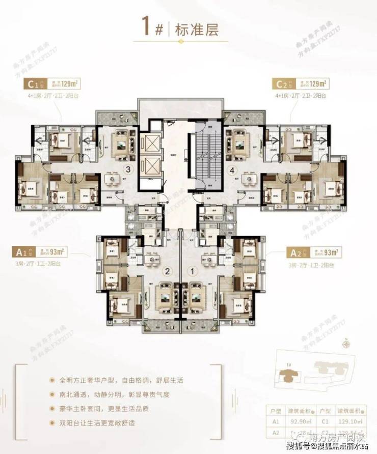将首推1号楼,主要有两种户型,以1栋为例,A1/A2为93平的3房1卫,A3/A4为129平的4+1房2卫,为精装修交楼,预计5月开盘。