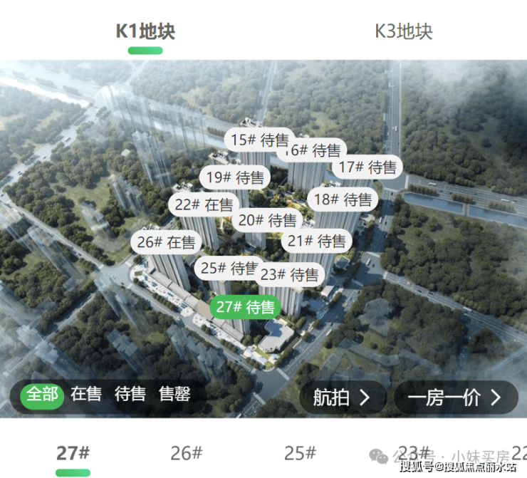 27号楼总高只有19层,另外20、25号楼总高为17层,这三栋是K1地块内总高最矮的三栋楼,便于区分,我们暂且叫做小高层,其余楼栋都是总高26-34层的高层超高层。