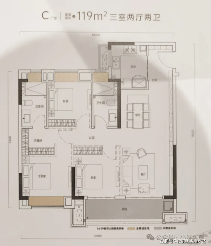 119平的边户,整个南向面宽约10米,这个尺度还比较亮眼,并且对比88平户型,119平的户型飘窗更多,可拓展空间也更大一点。