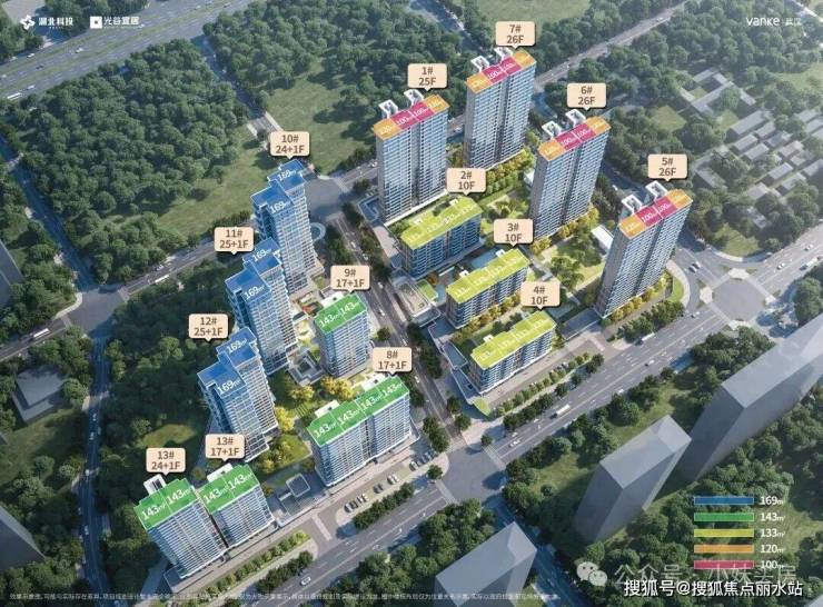 项目整体容积率为2.1,绿地率30%,共规划13栋10至26层的洋房、小高层及高层建筑,总户数843户,车位配比约为1:1.25,共计1052个车位。
