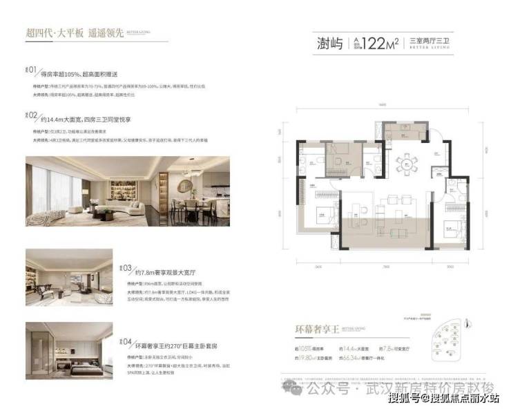 【超新质·超四代建筑大平板】 公建化立面 现代C型美学之作 特邀PTA上海柏涛,澳大利亚柏涛(墨尔本)中国合作单位,以至高水准匠造大师级立面——公建化外观,大窗墙比;大平板户型,较汉阳同面积段,面宽超15%——超四代户型:负公摊+超四代住宅大平板,得房率超105%+——户型设计,3LDK以上量级空间设计