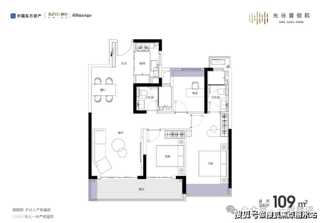 其中建面约109平户型跟之前的105平户型结构基本一样:三开间朝南的连廊中间套户型,主要是阳台和飘窗的优化面积,属于传统三代住宅。