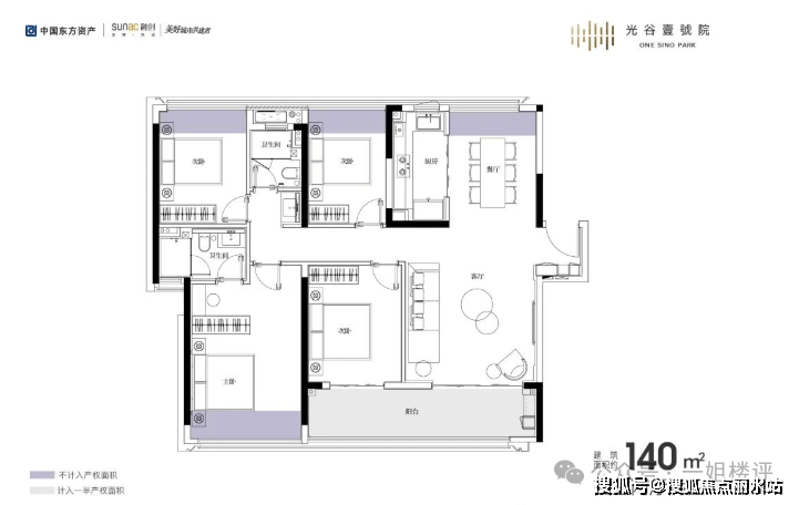 建面约140平的是边套四房:三开间朝南,南北通透,也是阳台和飘窗优化面积,不过飘窗面积相对多一些。户型方面跟现在的主流四代住宅还是有些差异。