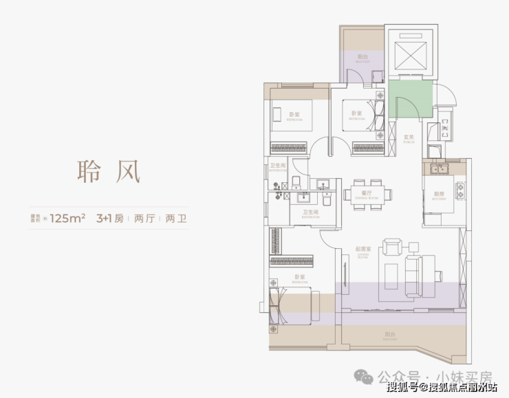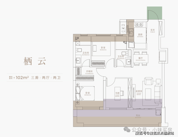 户型图上拓展面积做了明显区分,浅紫色为半赠送面积,主要就是阳台,灰棕色为全赠送,包含传统的飘窗,以及阳台外的露台(花池)。