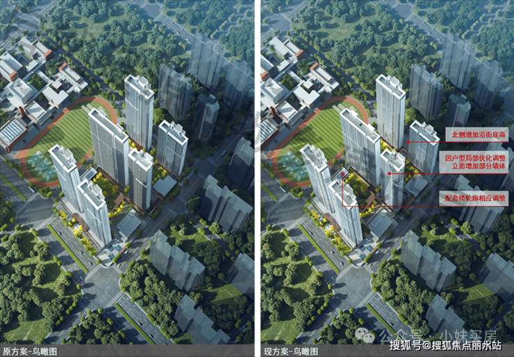 户型调整部分,也就是从三代住宅变成了四代住宅,同步引起了外立面的部分调整。