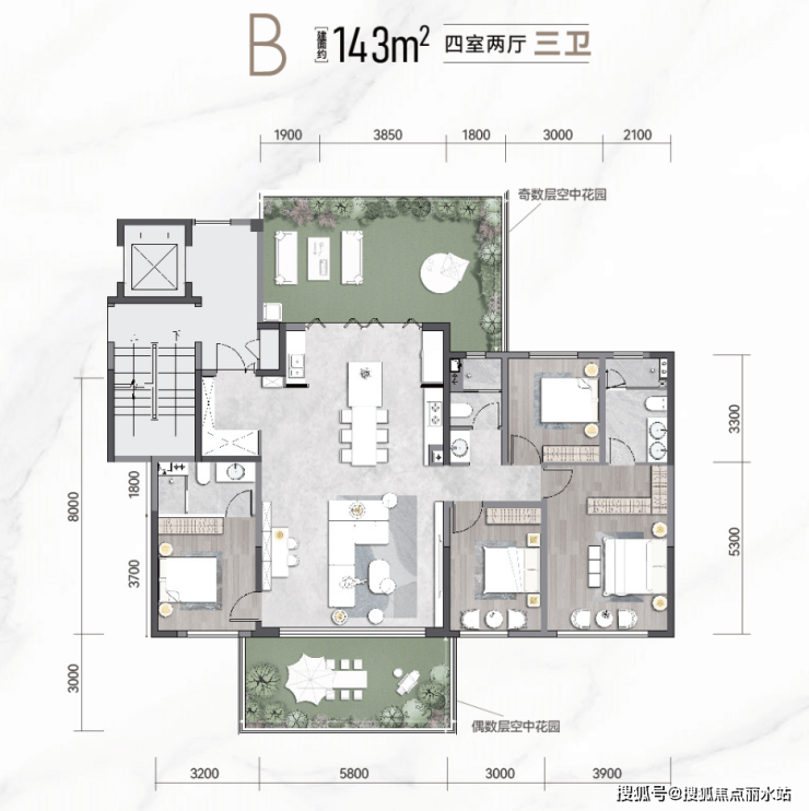 偶数楼层143㎡经典三叶草户型,私密舒阔卧室,起居互不相扰。LDKBG一体化设计,动区面积超 70m,满足高效丰富的生活场景。更有3+1灵动格局,可轻松幻变四房,应对家庭成员增长与多元空间需求。约16m空中花园,一半绿化种植,实现比肩院墅的生态享受。