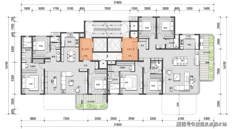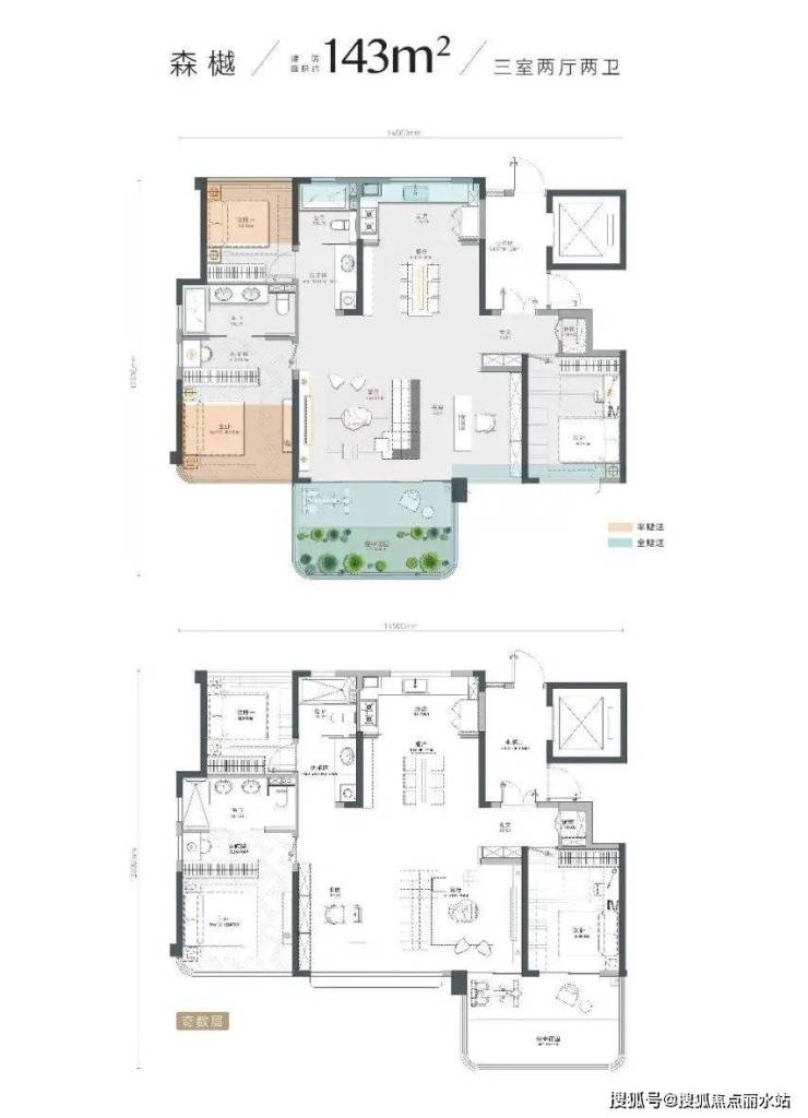 143㎡户型,花园会大一些,但没有明电梯厅。