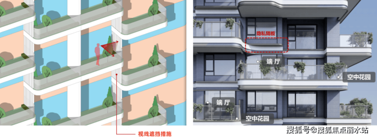 在错层的基础上,上下层的空中花园,使用绿化和半透栏板遮挡视线,避免对视的尴尬,并且,在上层住户的窗户前增加飘板,避免室内一眼看透,保证私密性。