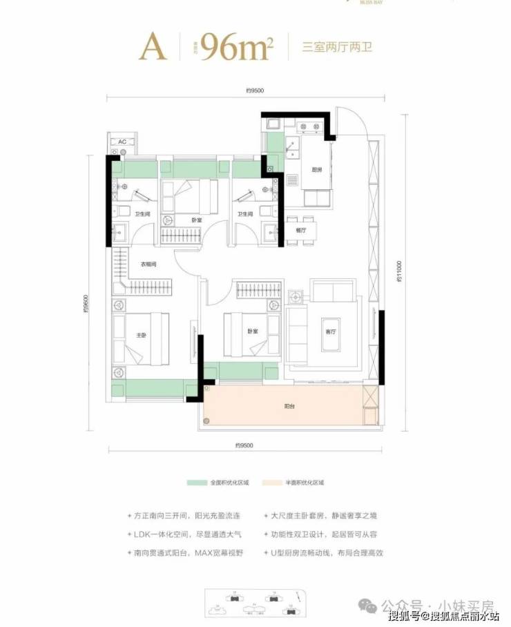 幸福湾·星樾仅用建面约96㎡,做到三室两厅两卫,相当于市面上传统120㎡的空间;
