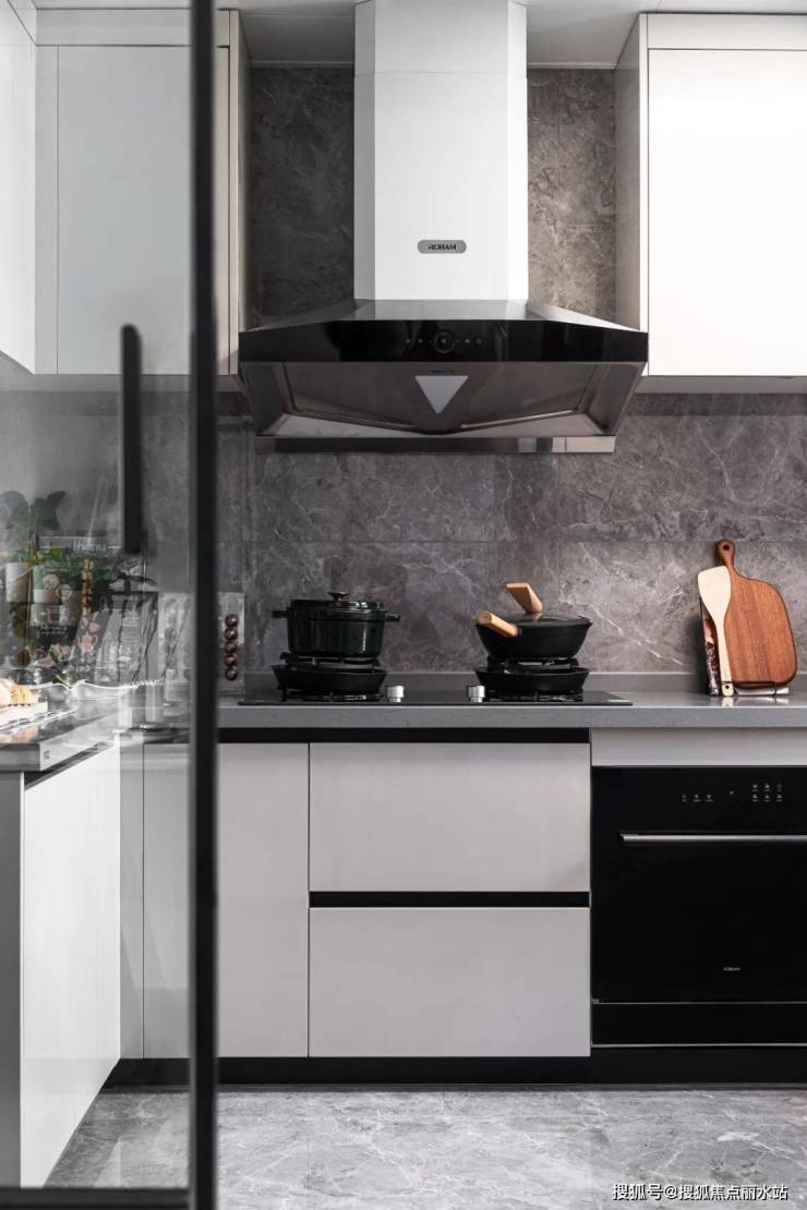 智慧厨房,油烟机、灶具都选用的是老板、方太;厨盆、龙头选用的是摩恩;还配有洗碗机和前置净水器,人性化的细节减轻了家务负担。