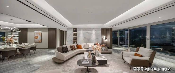 去年,局部外立面展示视觉上已相当惊艳,当整幢楼立面完整呈现,北立面如平静湖面映照着去留无意的蓝天云影,看细节,转角定制的曲面玻璃、顶部弧形飘顶,时代立面一贯的高站位审美,牢牢拿捏住了温州豪客。