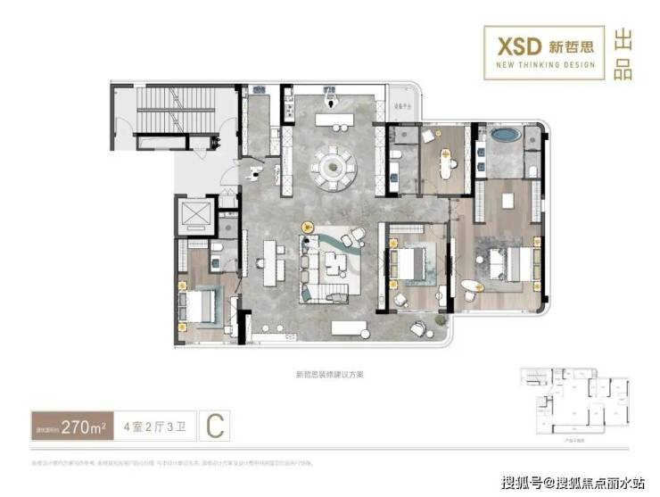 建面约270㎡户型位于5#、6#,处于小区景观“C”位上,南侧超万方中庭。