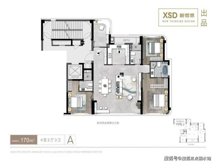 建面约170㎡户型。空间布局上,大面宽、短进深、近乎零过道,整体利用率高,这也是温州市场一直以来的王牌户型。
