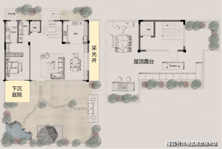 户型上,同样是一楼庭院+下沉庭院+屋顶露台的设计,部分户型可以拥有南北双庭院和双露台