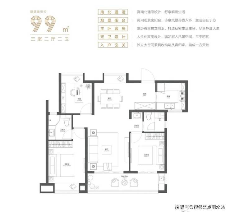 建面约99㎡户型,区别于市面上“流水线作品”,切实从用户生活的体验感出发,做到了从功能性到舒适度的迭代提升,将购房者期待的体面生活理想呈现。