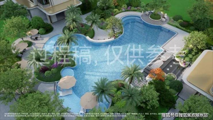 项目采用整体抬板设计,公区规划有恒温泳池、下沉庭院、会所、车马院、水系和全域风雨连廊等配置。