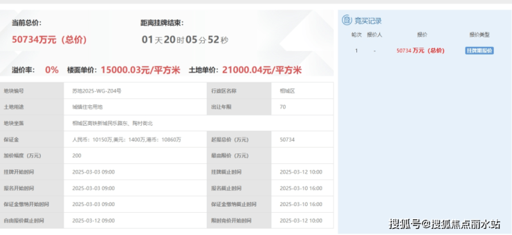 绿城宸庐,即苏地2025-WG-Z04号地块,位于相城区高铁新城民乐路东、陶村街北,是2025年3月12日,苏州宏腾&江苏汇欣鑫以5.53亿的总价竞得,成交楼面价15828元/平,溢价率5.52%。