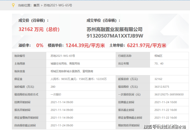 丰隆海纹中心,即,苏地2021-WG-65号地块,位于相城区高铁新城水景路西、富翔路南,是2021年11月24日,高融置业以底价32162万元竞得,成交楼面价1244元/平。