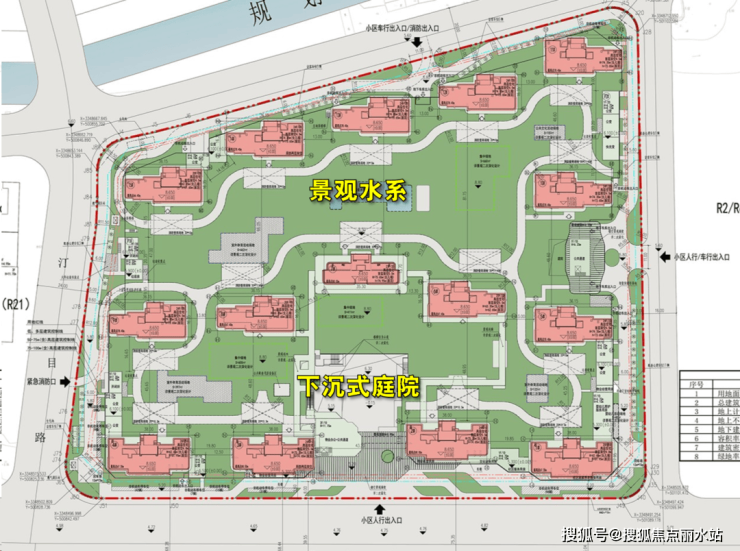 公区规划有下沉式庭院、室内恒温泳池、景观水系、风雨连廊等,主要主出入口位于小区南侧及东侧。