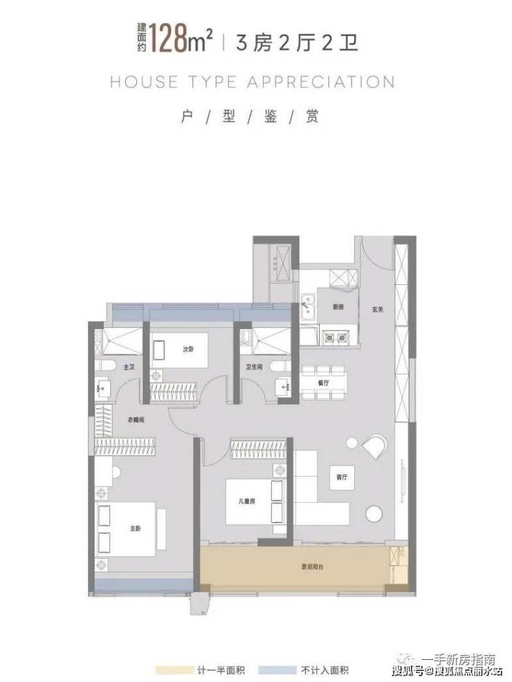 建面约128㎡户型(三房两厅两卫)