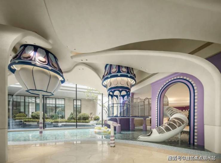 为关怀园区内孩子的成长,杭州溪径恒庐邀请国内顶级设计师,为孩子们打造了一个私家儿童水上游乐园,采用巨型树脂花组合滑梯可喷射彩虹水雾,防滑马赛克拼出抽象动物图案,既安全,又有趣味性。