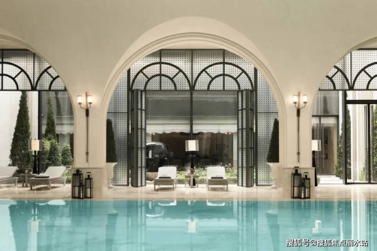 地下恒温泳池三面采光,顶部是15米玻璃天顶倒映着空中花园水景,泳池底部300万片马赛克拼出名画《睡莲》局部。两侧黑色铁艺屏风外是下沉庭院,让业主在游泳的同时也可看到外部的自然景观。