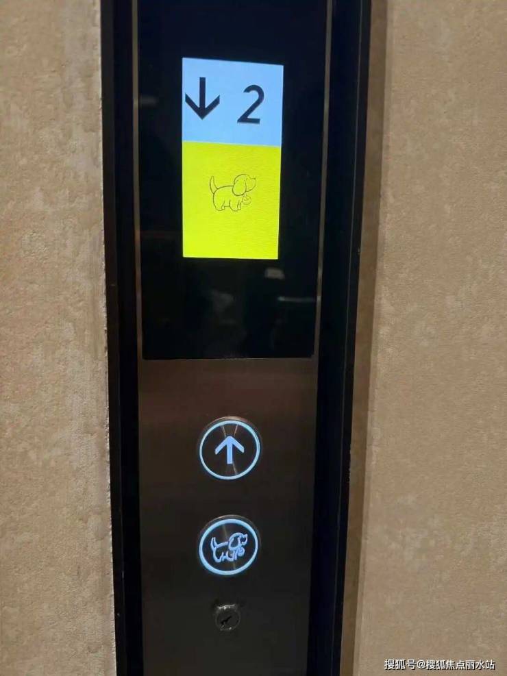 七里江澜甚至专门在电梯内设置了宠物友好按钮,开启这个按钮后,在外面每层的按钮面板上会显示上面这个图案,提示现在电梯里有宠物存在,这个设计很人性化,“对不喜欢宠物狗的业主比较友好”。