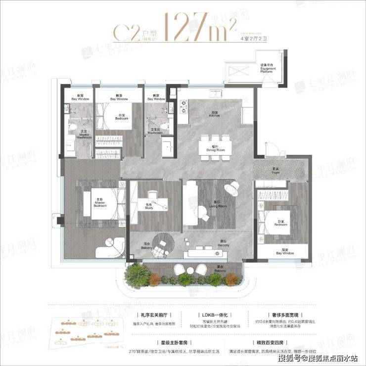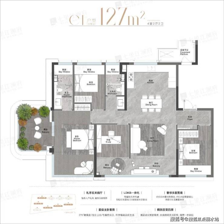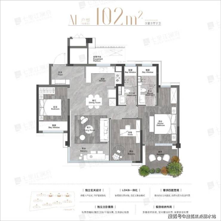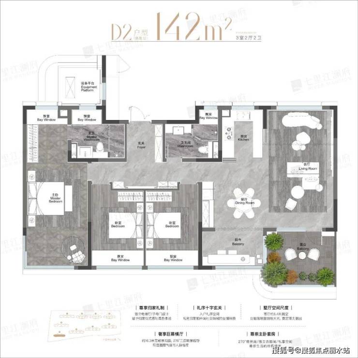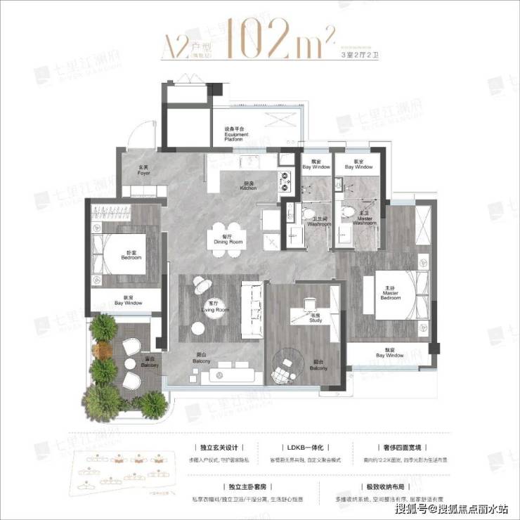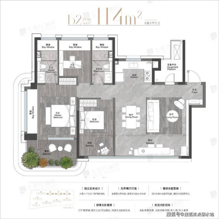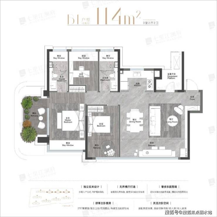 主卧大套间,带有独立卫生间,270°观景面,比起102㎡改善尺度更大。露台做了主卧空中花园,不占用阳台的独立功能。