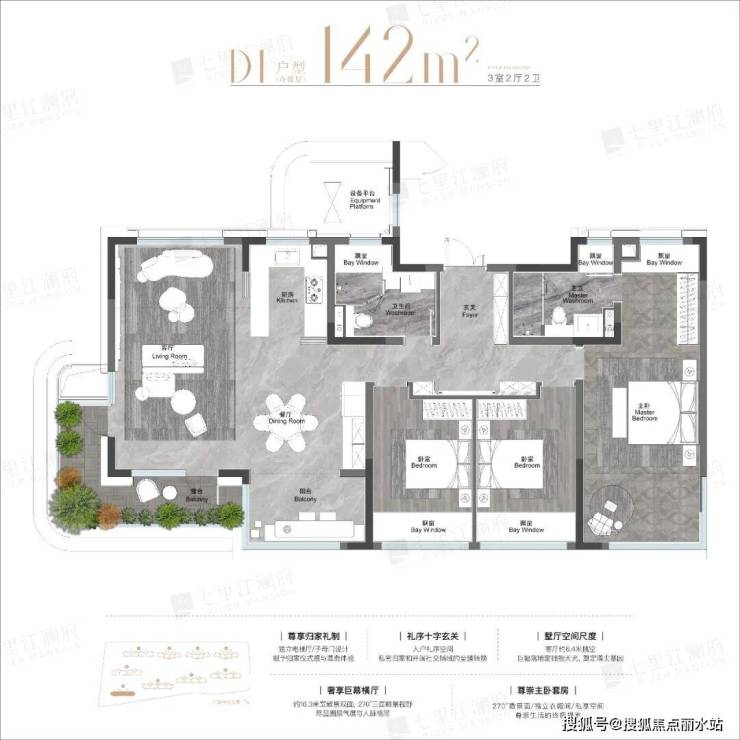 ③ 空间创新:七里江澜府创新打造浮岛立体错层露台,通过科学布局,一户一露台,有效规避上层遮挡,更大程度保护了私密性。