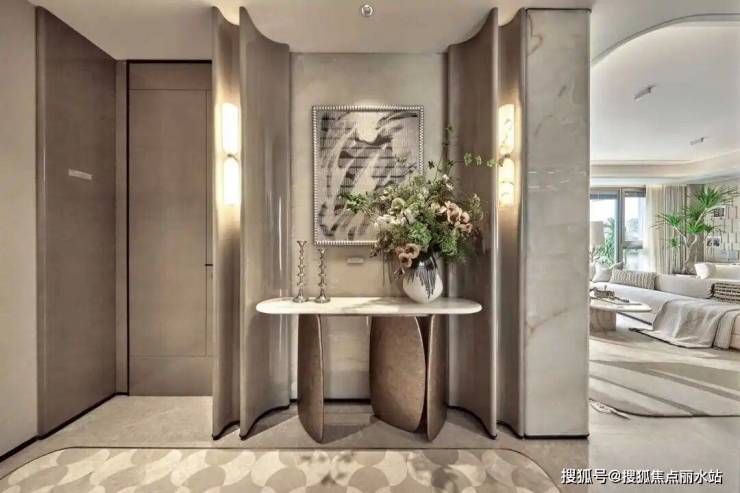 一梯两户采用了对开门电梯设计,既享受了一梯一户独立门厅的尊崇感,又没有一梯一户那么大的公摊,而且独立玄关还设置了收纳柜、遮挡照壁,既解决了隐私的问题,又解决了收纳的问题。