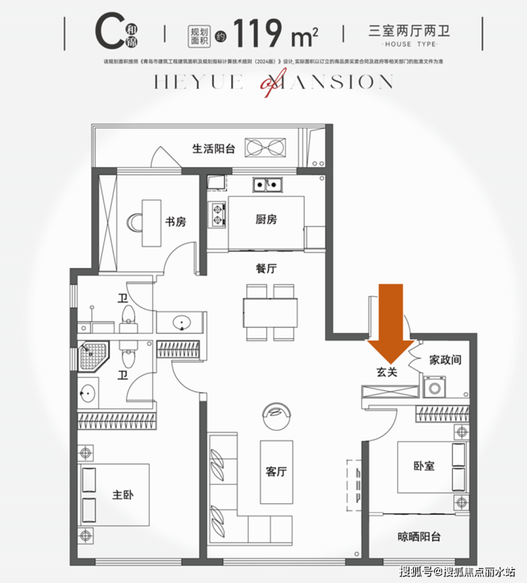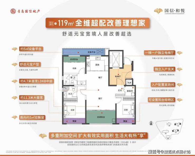 1、户型格局提升:青岛人最喜欢的元宝户型,有独立电梯厅、独立玄关、家政间这些最新的户型功能空间;
