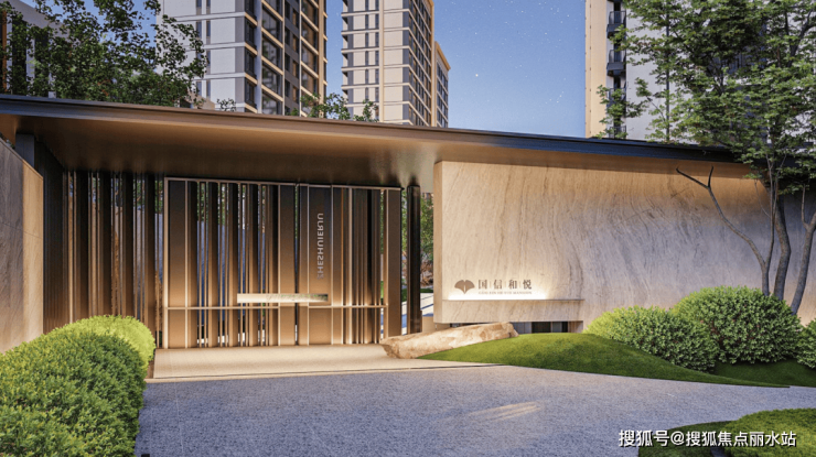 今天,社区大门成了社区形象第一眼。国信和悦的归家大门高度约5.8米,宽达21米,大门两侧采用全石材干挂,大门挑檐采用高品质的金属铝板,显现居住者的尊贵大气。