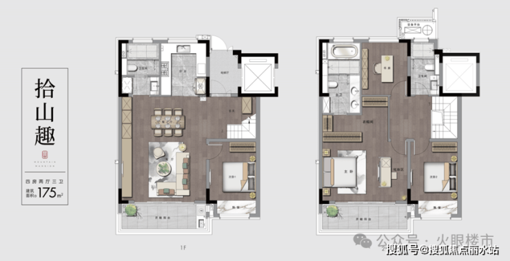 叠加为上下2叠,建筑面积175㎡、198㎡,均为4房2厅3卫的房屋套型。
