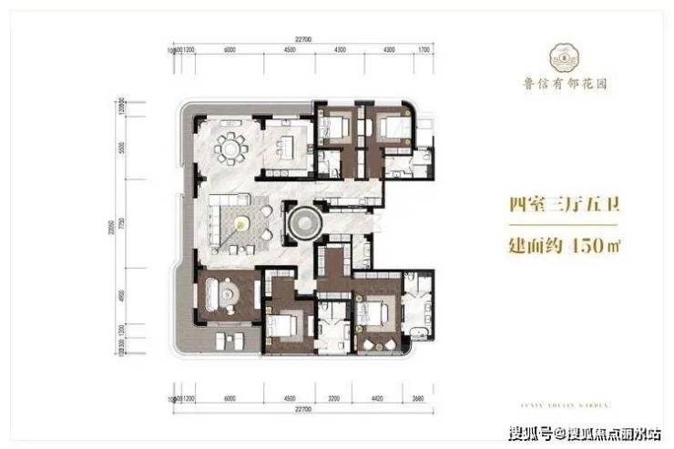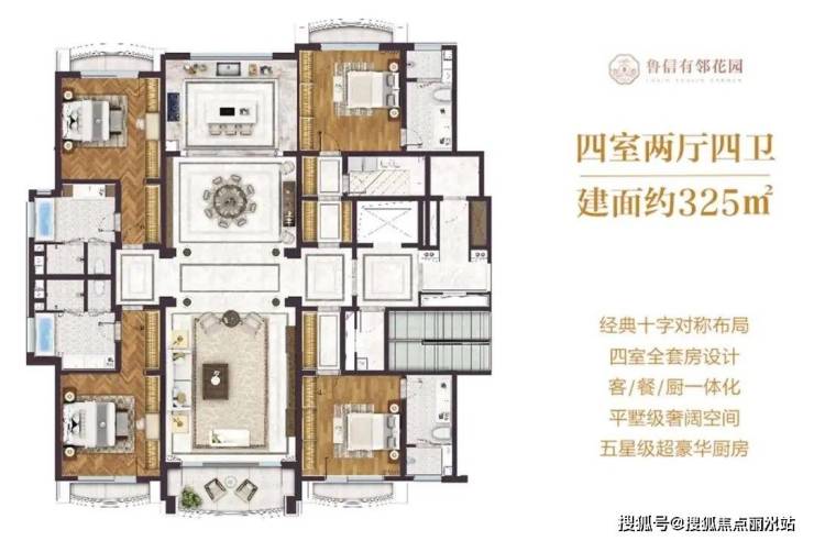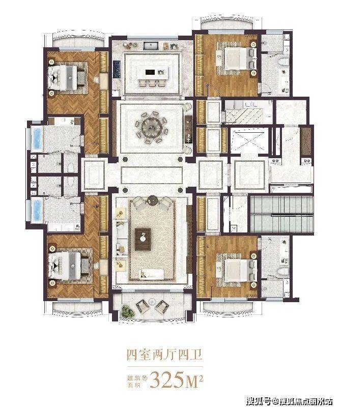 项目主力户型为325㎡四房两厅四卫,公摊仅约15%,超高得房率。