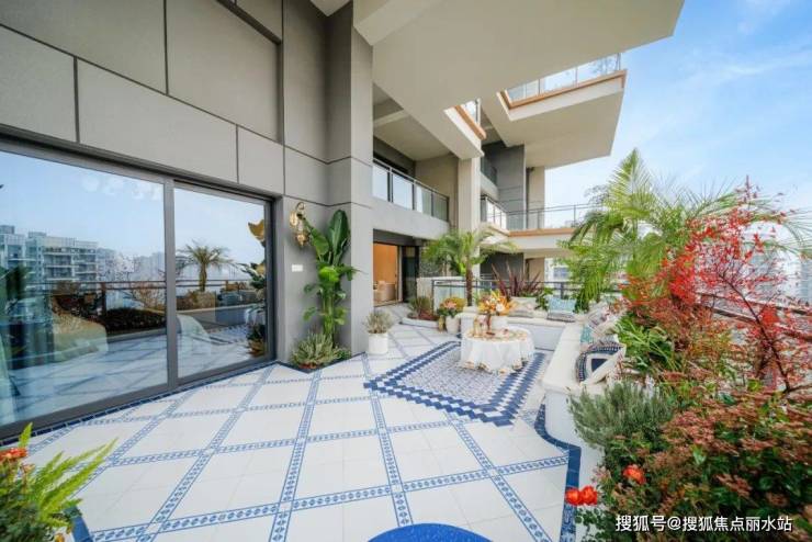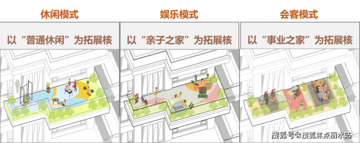 其次,在生态阳台的营造上,打破单一传统的仅有生活阳台与景观阳台的组合方式,将景观绿化与休闲功能相互融合,集休闲、生活、景观绿化于一体的复合化多功能庭院;同时将客厅、餐厅、厨房、阳台以及种植植物的庭院联动在一起,形成与别墅基本一致的生活场景体验。