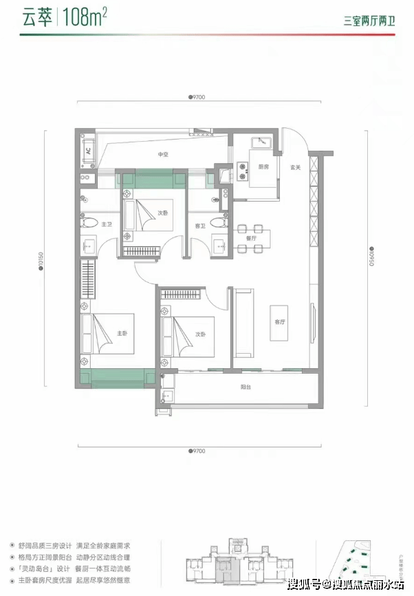 建面约108平 三房两厅两卫