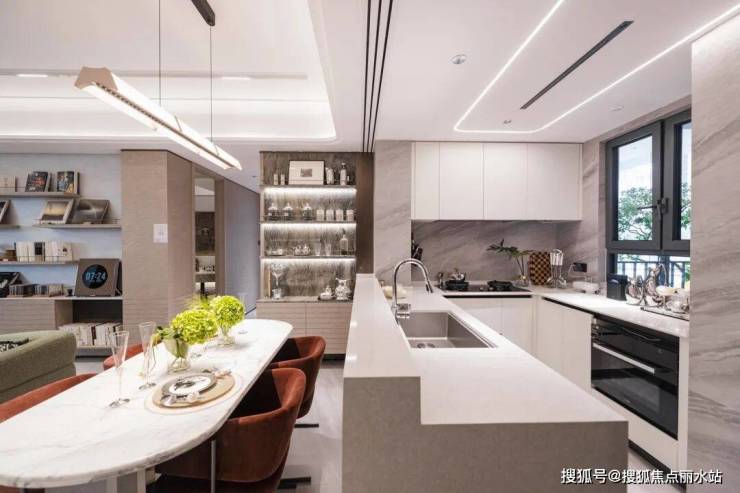 “效率厨房”精准破解空间浪费、收纳不足的难题——冰箱空间外移 S 墙(贤坤花园同款设计)不占用室内面积,搭配方太可升降油烟机、灶具、16件集成洗碗机等,既节省了空间、更是做到高效下厨。
