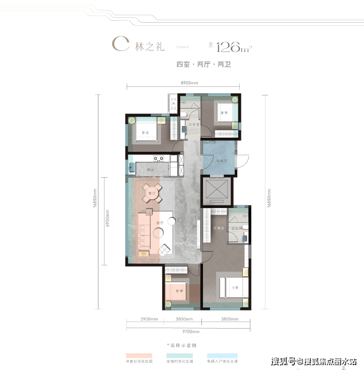 建面约126㎡的四房两卫户型,则完成了从“房间数量”到“生活质量”的格局跃迁