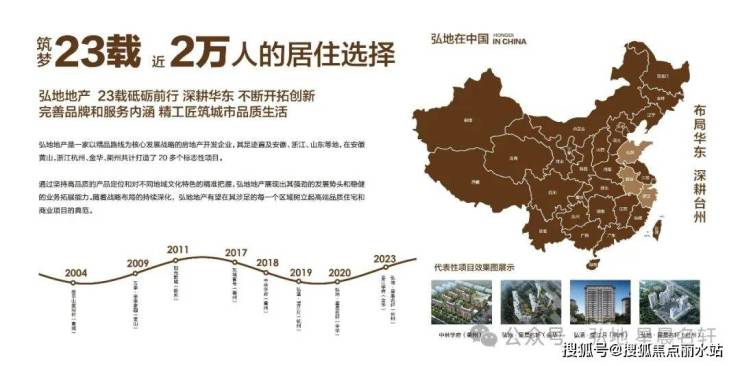 弘地地产,23载砥砺前行,深耕华东,不断开拓创新,完善品牌和服务内涵,精工匠筑城市品质生活,其足迹遍及安徽、浙江、山东等地,在安徽黄山,浙江杭州、金华、衢州共计打造了20多个标志性项目。
