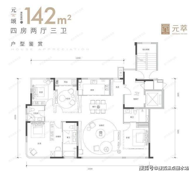 142平4房2厅3卫,拐角270角的主卧,同样朝北次卧带北阳台。