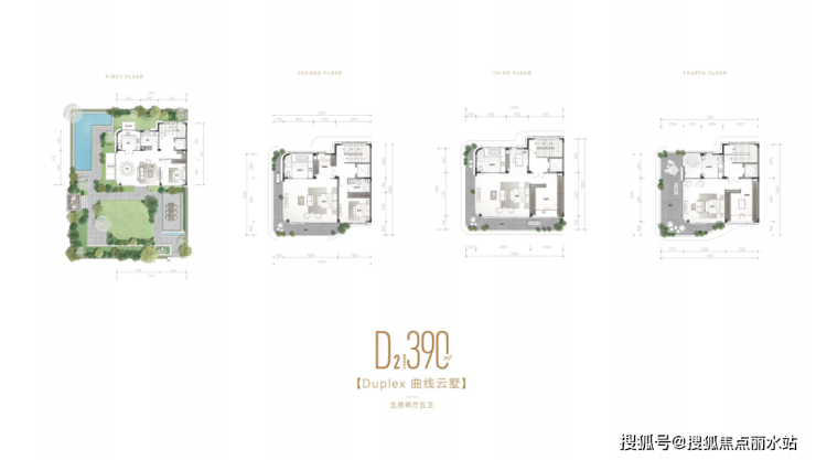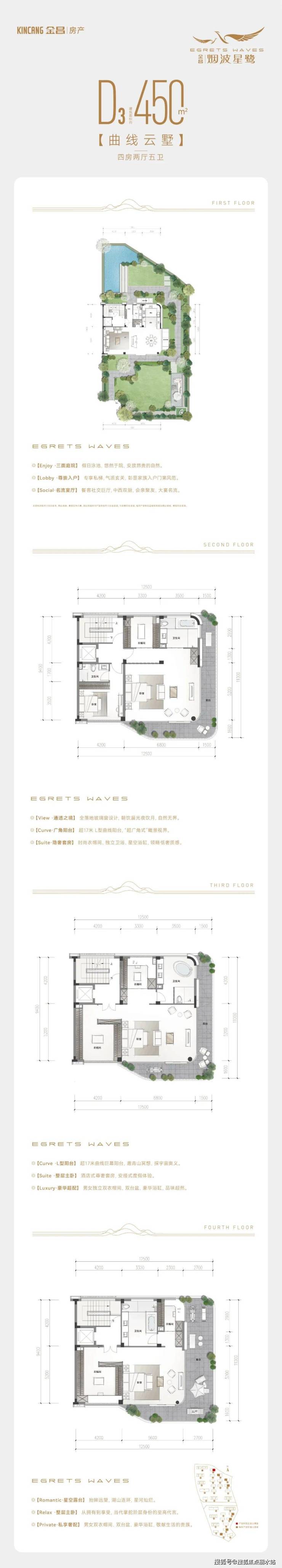 设计融汇“纯粹的低密、流动的曲线、云间的别墅”等引领性、超越性设计,三维曲线,高定铝板线条,筑就当代向往的隐奢秘境;依托三水围合生态,借鉴全球度假酒店湄南河四季酒店景观理念,打造约3.8万㎡低奢酒店式园林;1.4容积率之上,缔造曲线云墅、星河叠墅两大藏品。