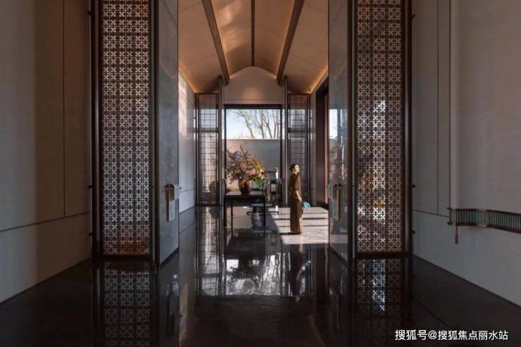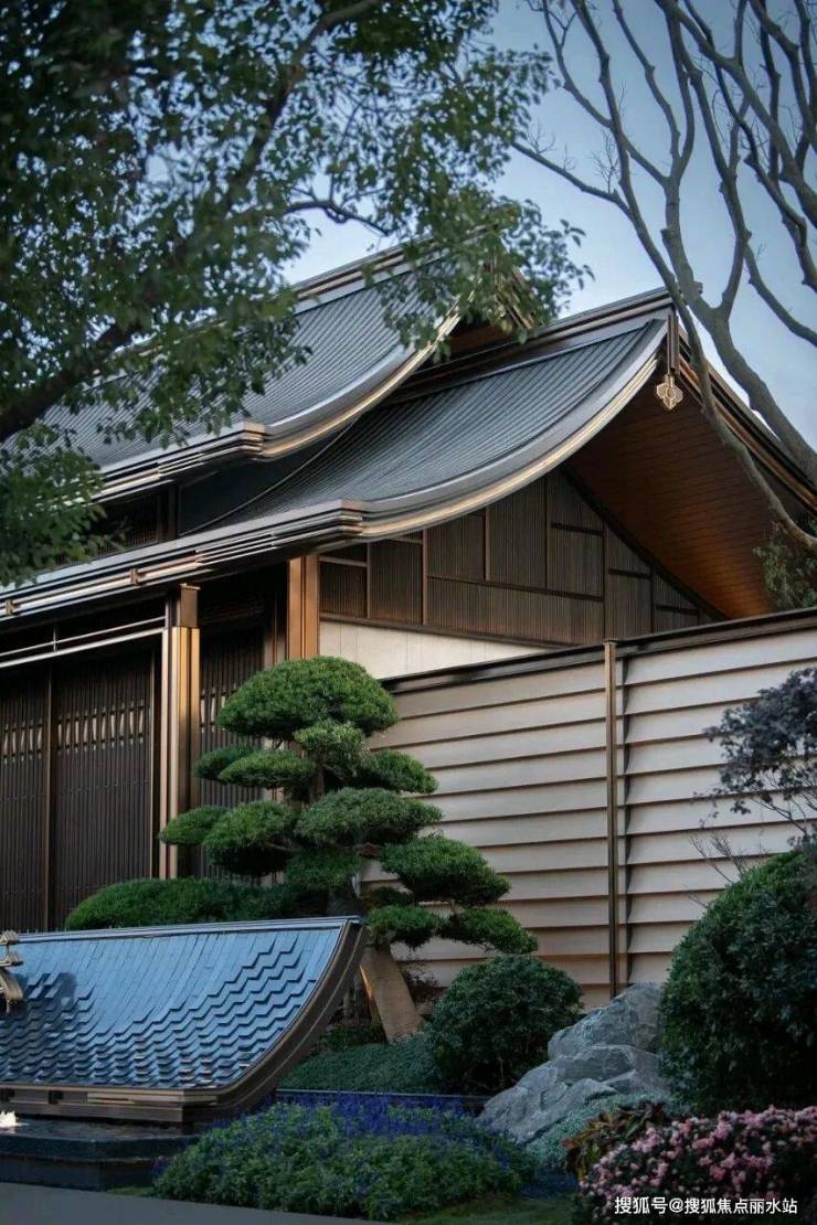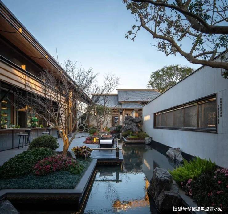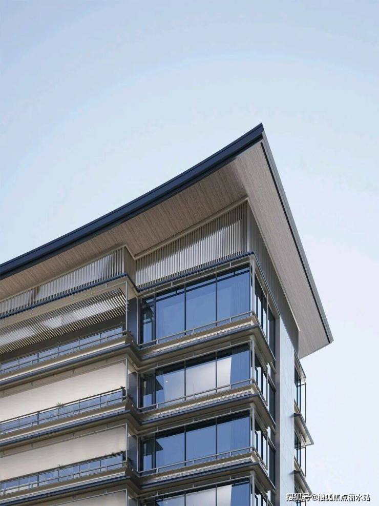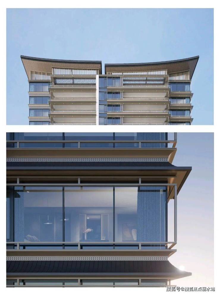 建筑立面设计大面积玻璃墙面清透如水,明暗对比与色彩过渡自然惬意,与周边景色融为一体,飞檐沉静如山,与玻璃面相映,如同山水层叠,交织。BAC佰恺设计的创意 “翘角飞檐”,如同传世名画《瑞鹤图》中自由栖居的仙鹤,命名为“千鸟脊飞檐”。弧度经过反复调整,最终以低调灵动的现代立体设计语言重现飞鸟清丽脱俗的神态,成为立面设计上的点睛之笔。窗框下部采用了“美人靠”构件,精致简约而又细节感十足,层次上步步递进,还原宋代风貌特征,具有极高辨识度。