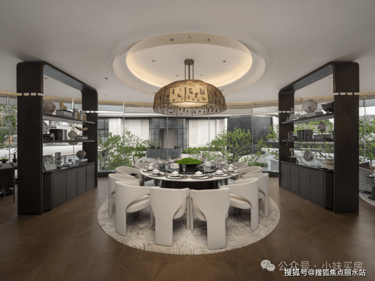 整个会所围绕着下沉式园林打造,包含上下两层,园林内还设置有大面积水景,景色相当不错
