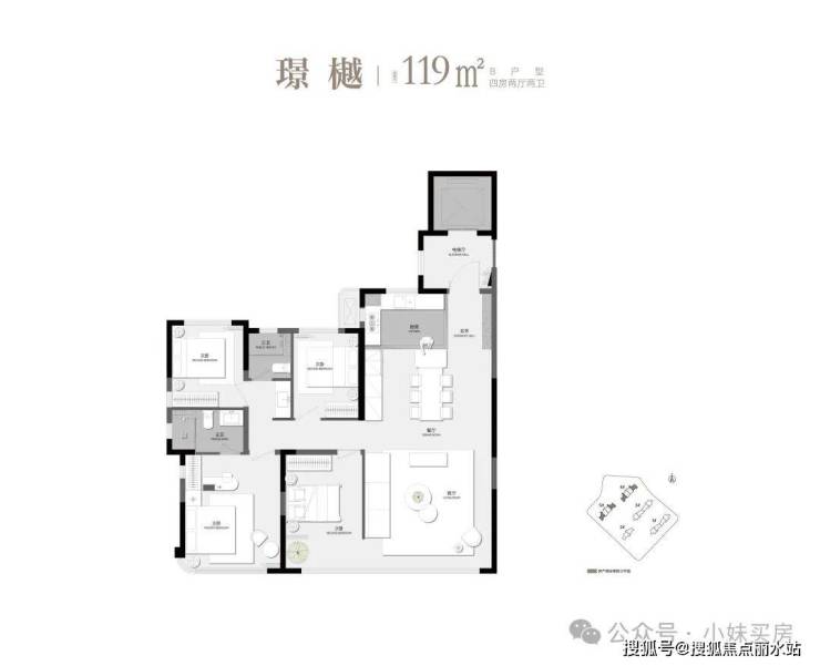 它的亮点还在于,以119平传统三房的面积轻松便实现了大四房两卫,堪比市场传统140+平户型。