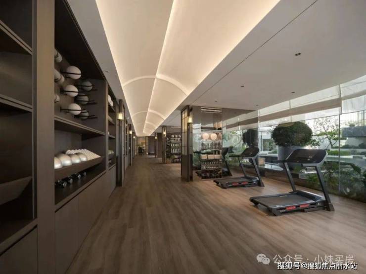 功能分区、采用高端品牌器械的私教级健身房,搭配全景镜面玻璃,将室外中央水院的艺术景观引入室内