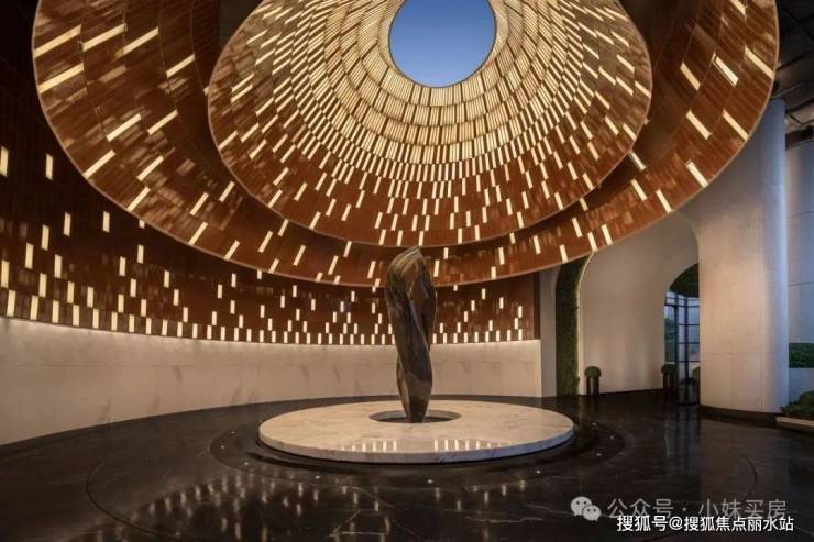 人行主入口,由11166片高定陶砖+透光云石,纯手工拼接而成的三层编钟造型曲面,不仅是对荆楚礼乐文化的现代演绎,更营造出轻松愉悦的归家氛围