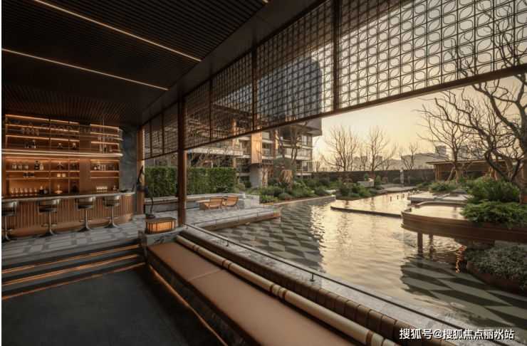 穿过大堂之后是艺术风雨连廊,艺术连廊的设计让业主下雨天也能在园区自由漫步,连廊以镂空线雕工艺打造“锦上添花”金属垂帘,更显精致风雅,艺术连廊与小区园林及水景交融,带来度假般的松弛感。