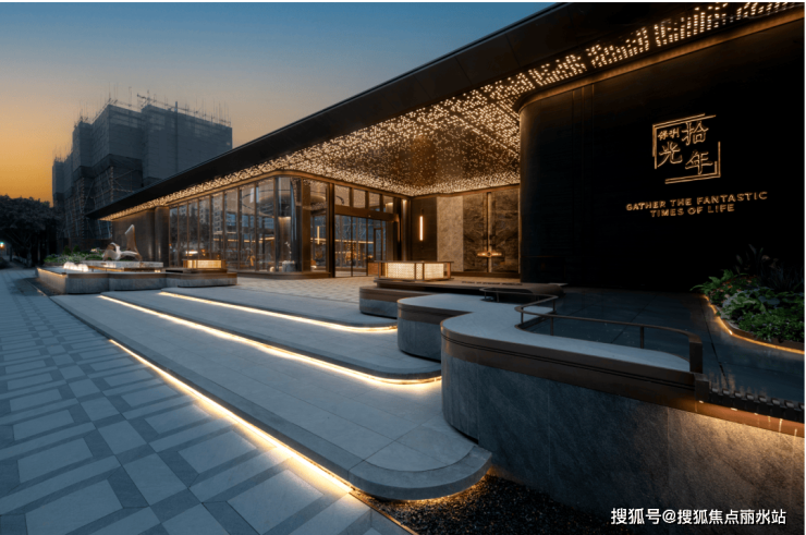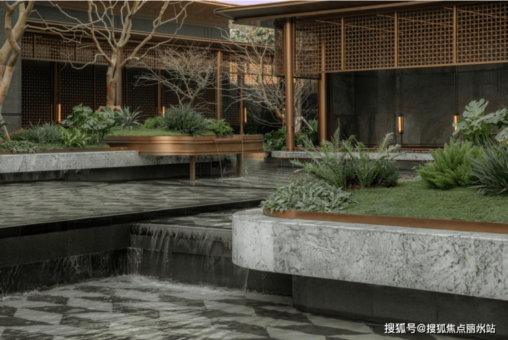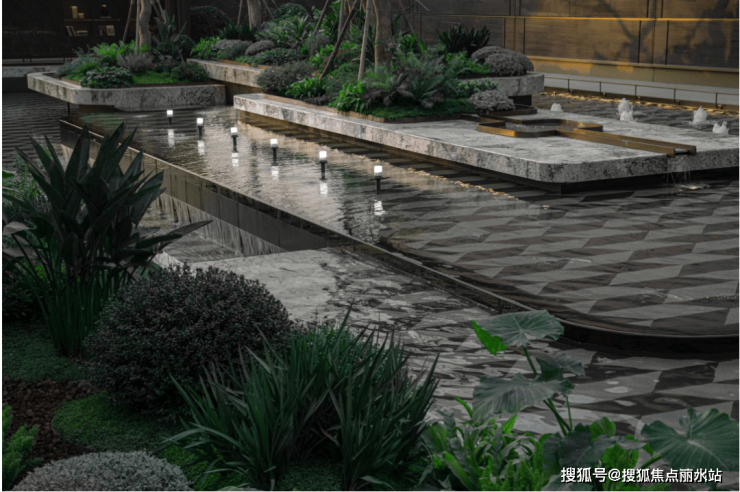 进入小区之后可以看到约750平米的流光水庭,涌泉、跌瀑等形式丰富的水景搭配花团锦簇的绿植,让区空间尽显奢雅气质。